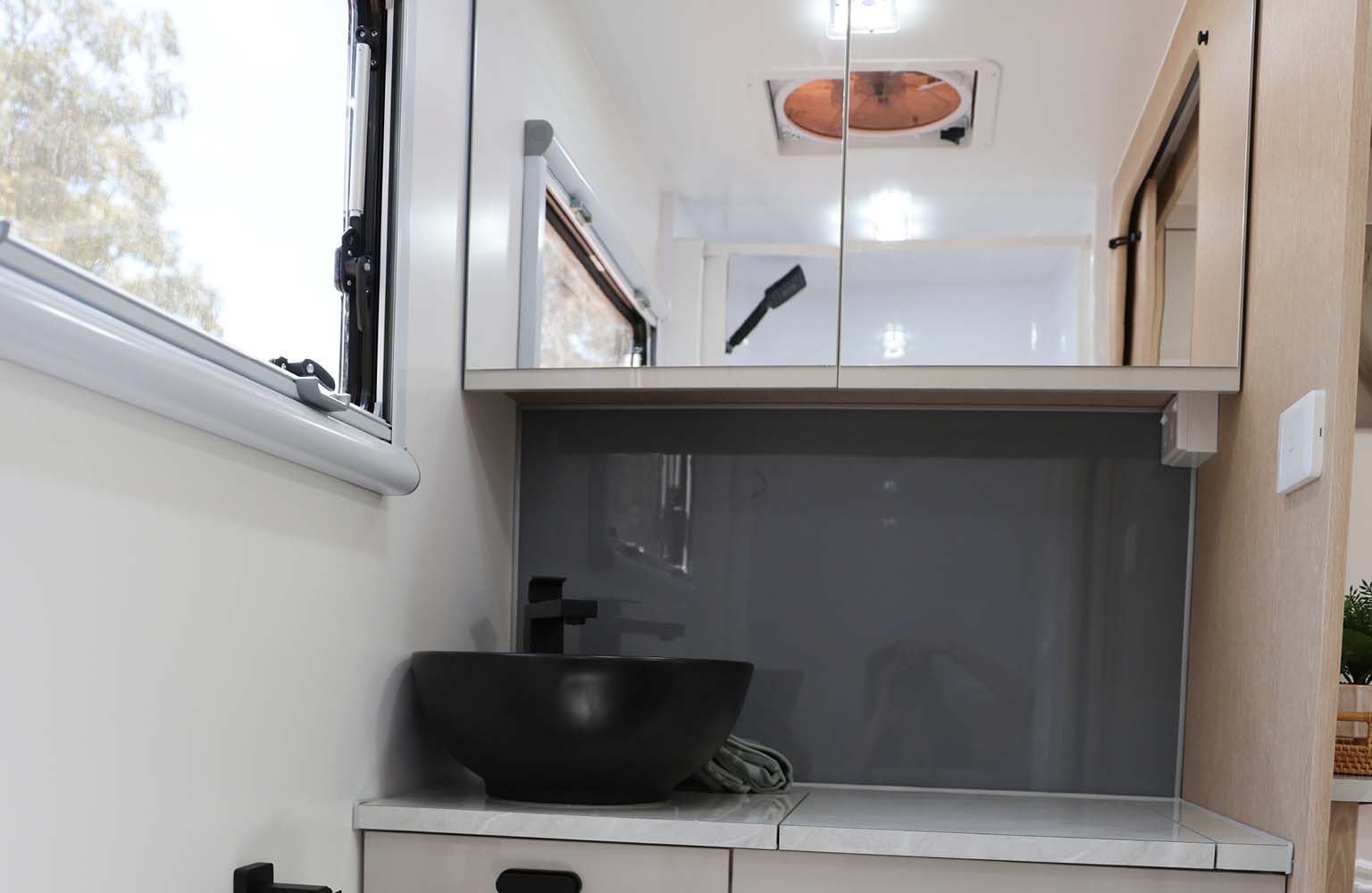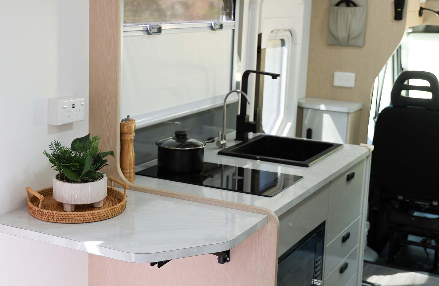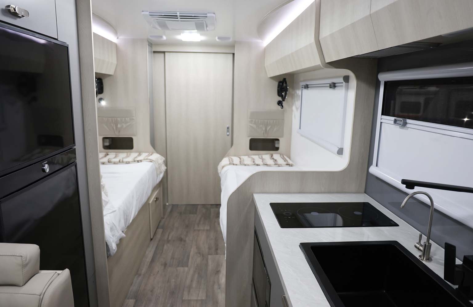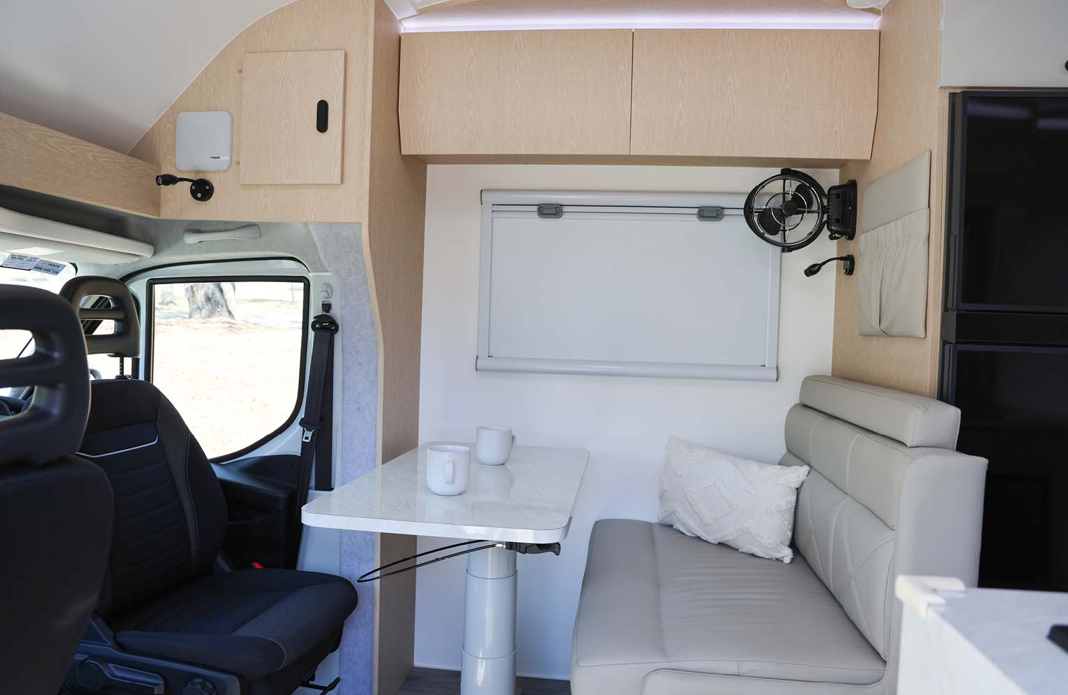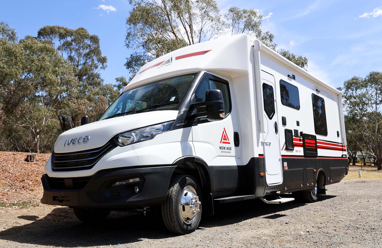Take full control of your bitumen adventures with the beautiful New Age NAM8 motorhome meticulously built upon a smooth but powerful 8-speed 3L Iveco Daily. There’s room for up to two travellers in a choice of twin single berths or one of two queen-size layouts with a choice of bench or cafe seating.