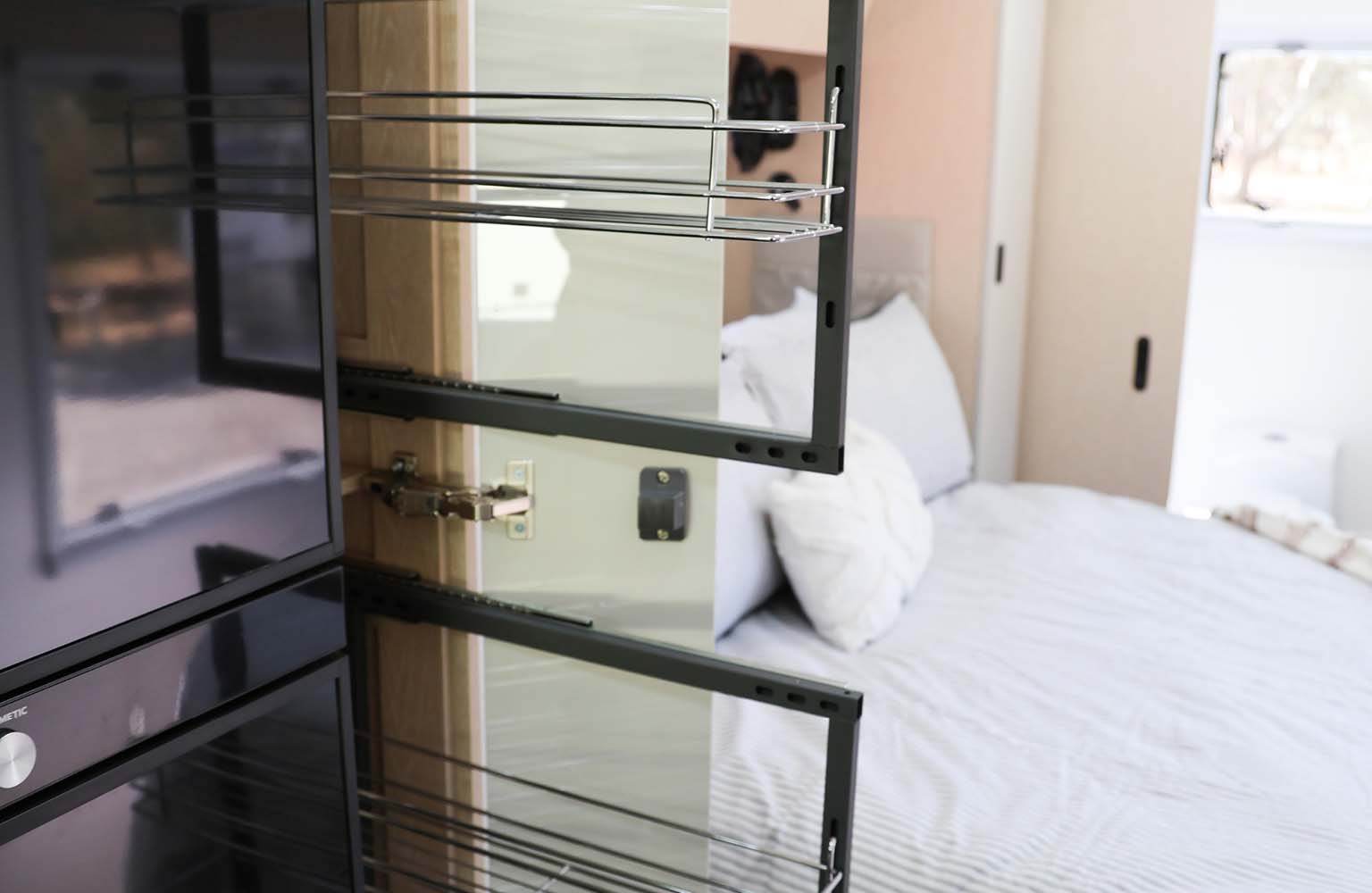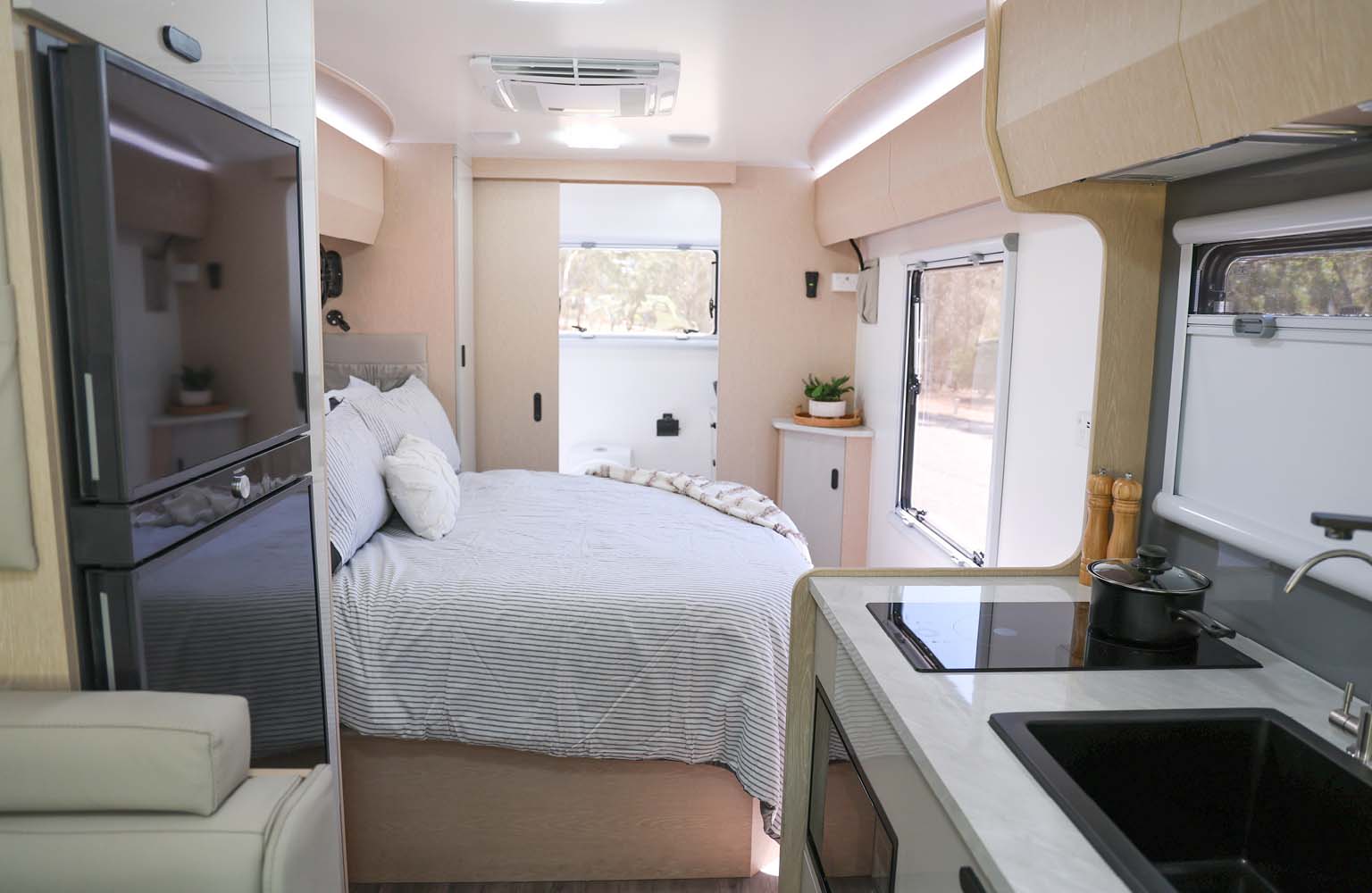 Distinct from many other RVs, the queen-size New Age NAM8 models offers full access from three sides to the east-west queen size bed with the ensuite adjacent just like your master bedroom at home.
